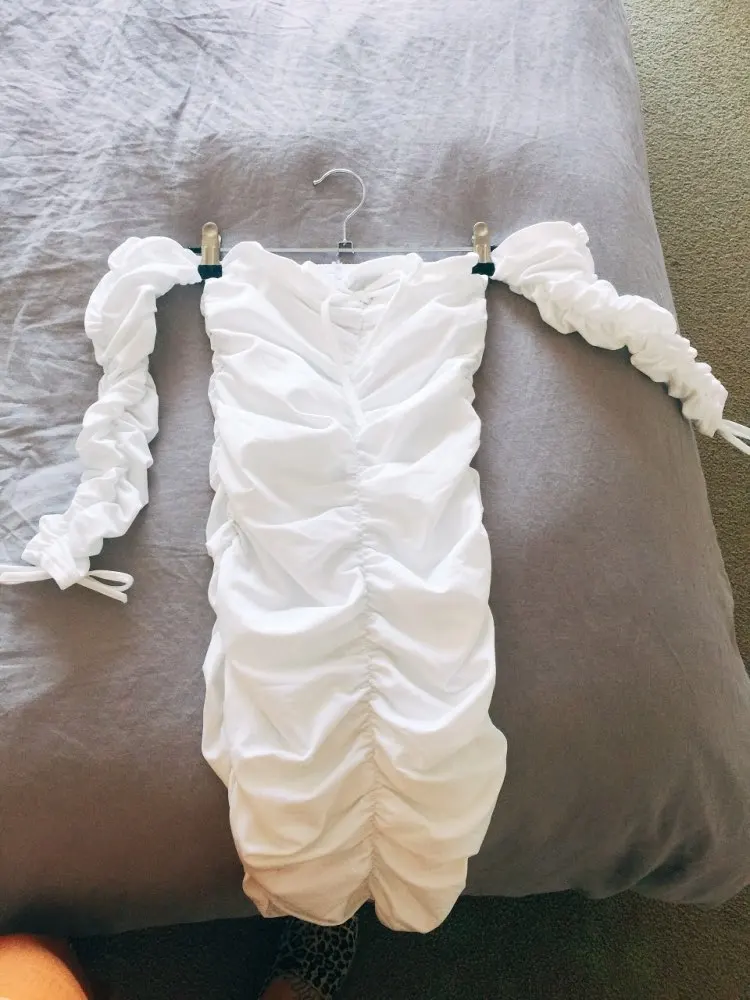Fast shipping however dress has subtle stain on front of dress and did not remove even with soaking and washing, the cotton is cheap and sleeve upon trying on cotton was snapping so had to re sew sleeve. However material is quite thick so not very see through at all, good quality material and dress fits well, have to be careful when putting on because I feel like the dress will fall apart at the seams if I don’t lol. Use stronger cotton!
